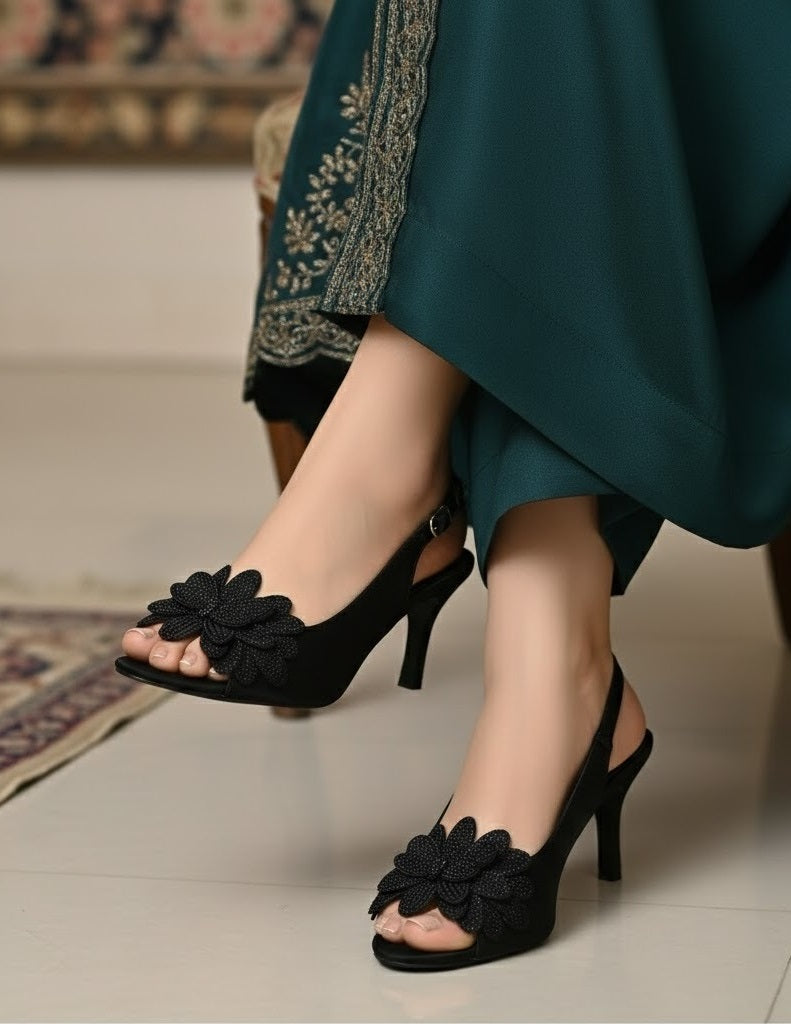 The Eva heels are designed for in satin finish high quality fabric, soft sole and balanced according to comfort. With petal embellishments on the top perfect for all the outings.